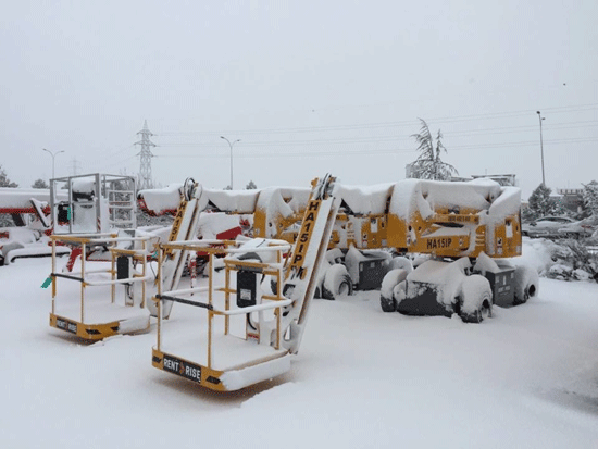 - 十分なトラクションを確保: 雪や氷でタイヤのグリップが弱まります。必要に応じてオールテレーンタイプの高所作業車やチェーンを使用してください。